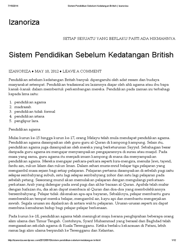 Sistem Pendidikan Sebelum Kedatangan British Izanoriza