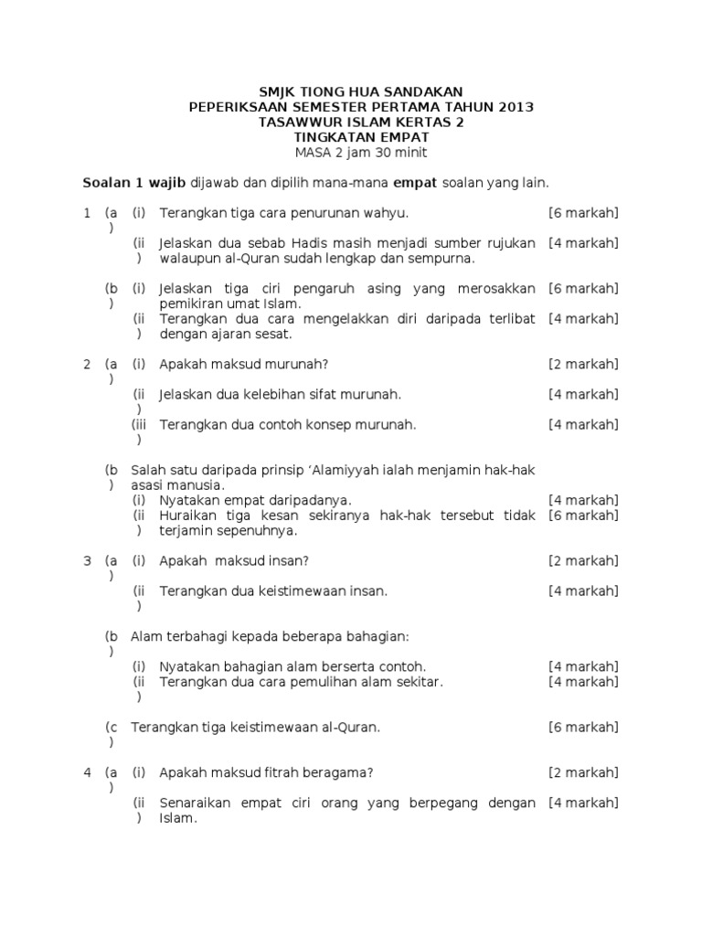 Smjk Tiong Hua Sandakan Peperiksaan Semester Pertama Tahun 2013 Tasawwur Islam Kertas 2 Tingkatan Empat
