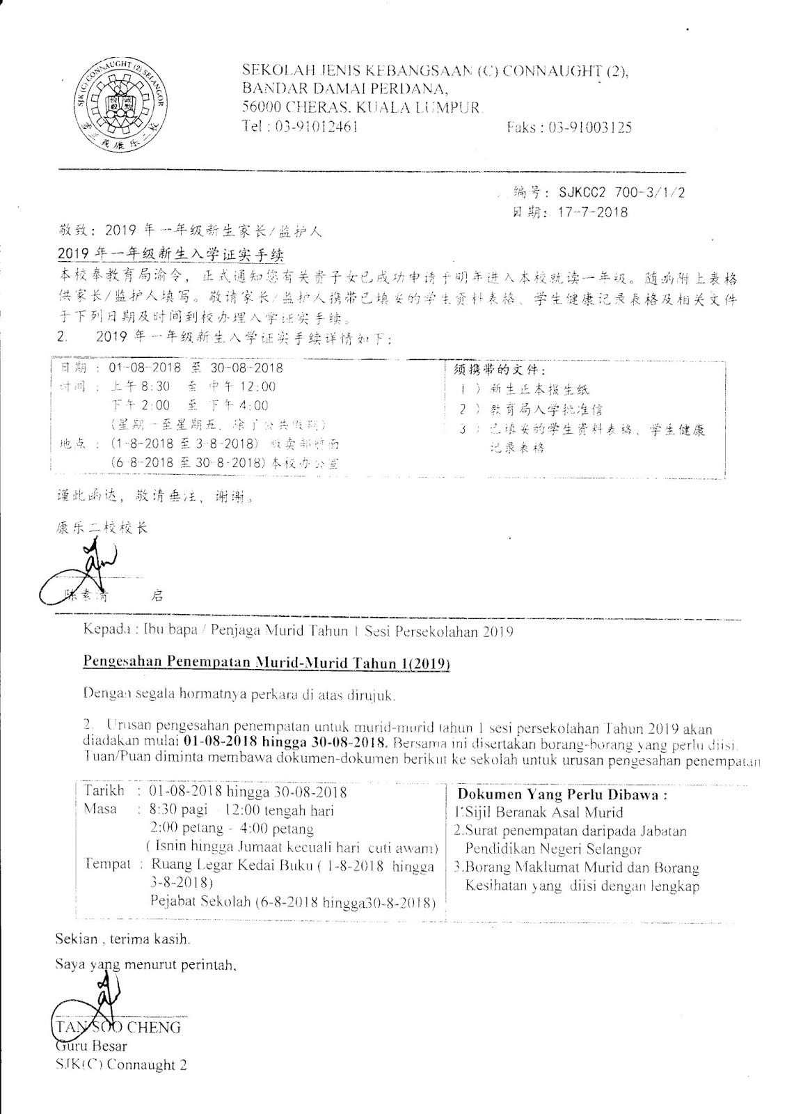 Connaught2 2019年一年级新生入学证实手续 Pengesahan Penempatan Murid Murid Tahun 1 Sesi 2019