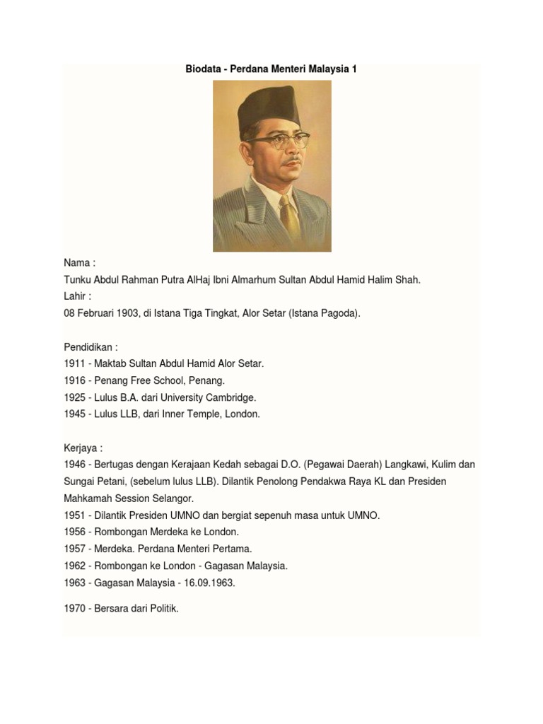 Biodata Perdana Menteri Malaysia Pertama 13 Tahun