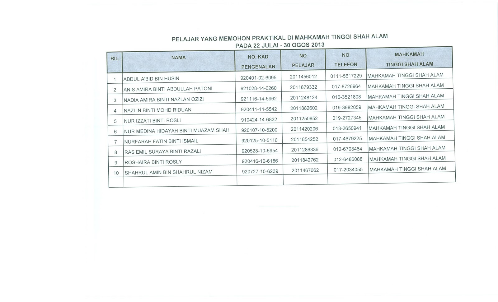 Kehakiman Syariah Negeri Selangor Pelajar Praktikal Di Mrs Hulu Selangor