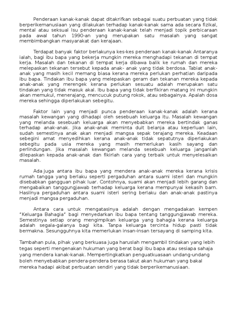 Penderaan Kanak Kanak Karangan 1 Pengenalan Penderaan Merujuk Kepada Penderaan Secara Fizikal Dan Mental Terhadap Manusia Penderaan Kanak Kanak Course Hero