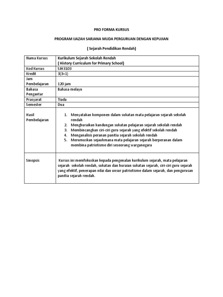 Proforma Sjh 3103 Kurikulum Sejarah Sekolah Rendah