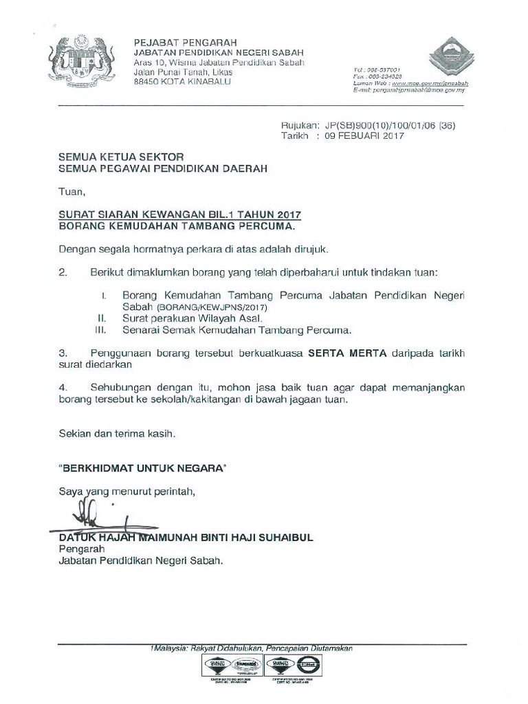 Surat Penghantar Borang Permohonan Tambang Percuma Mengunjungi Wilayah Asal Di Bawah Pekeliling Perkhidmatan Bil 22 Tahun 2008 Lampiran A1