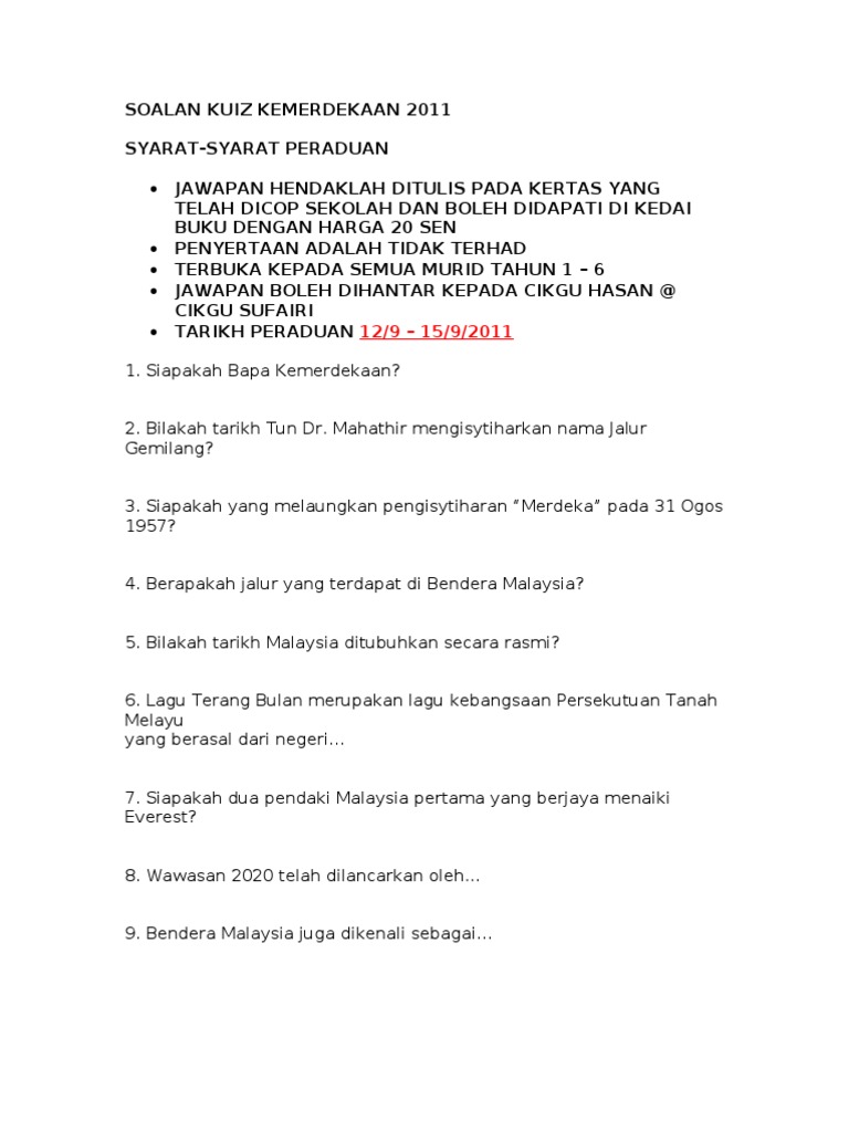 Himpunan Terbesar Kuiz Kemerdekaan Sekolah Rendah Yang Menarik Dan Boleh Di Perolehi Dengan Cepat Pekeliling Terbaru Kerajaan