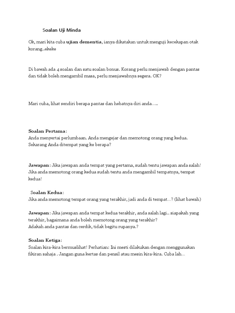 Soalan uji minda dan jawapan. Mari uji tahap kepintaran anda dengan 4 soalan ini. Mengandungi 14 jalur merah dan putih melintang yang sama lebar bermula dengan. Ini adalah antara soalan yang menarik kerana pasti kita akan tersenyum bila kita selesai membaca dan menjawabnya. Anonymous february 29.