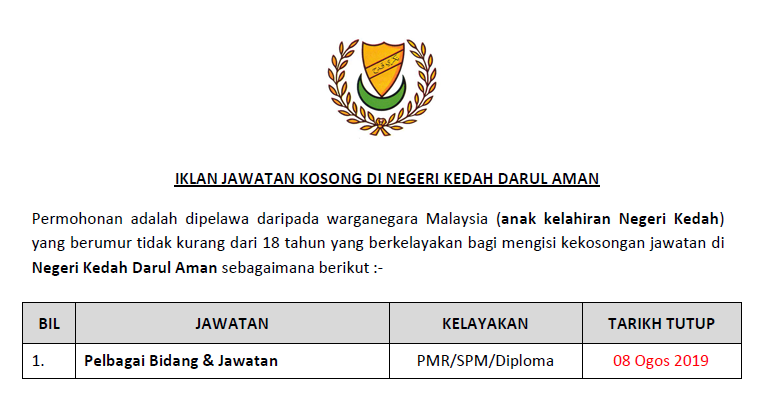 Jawatan Kosong Negeri Kedah Darul Aman Kelayakan Pmr Spm Diploma Ejawatankini Com